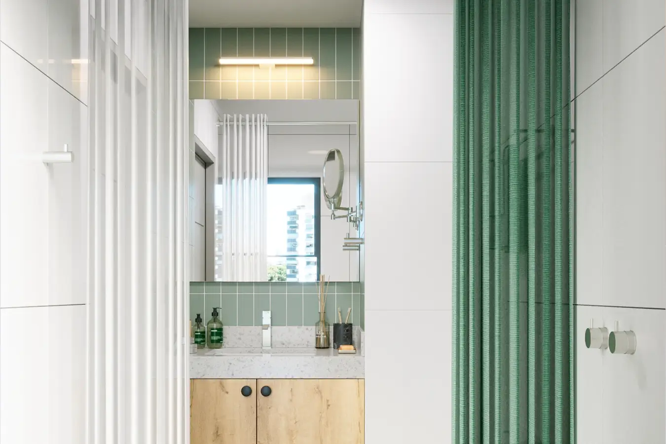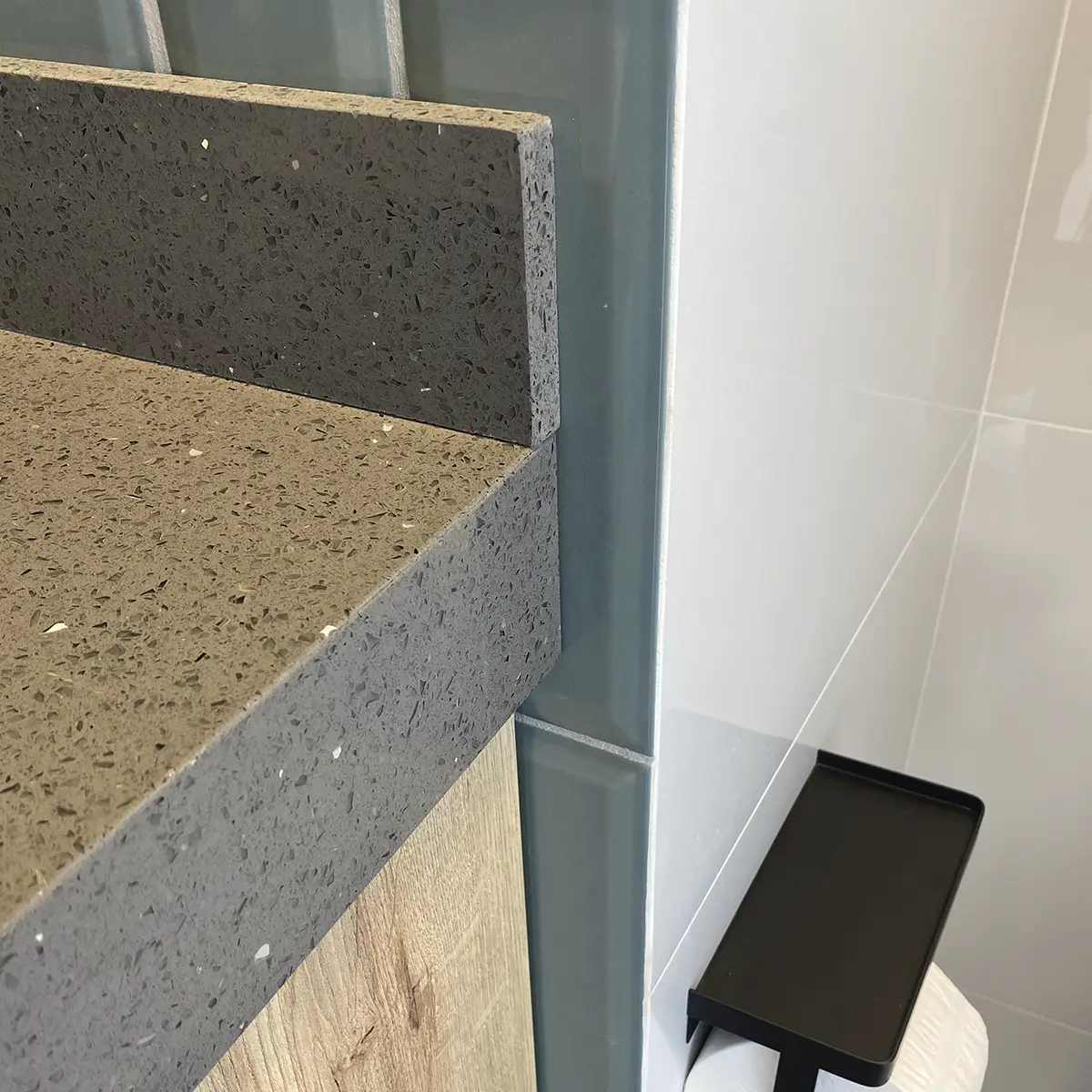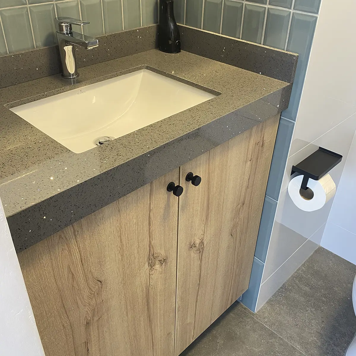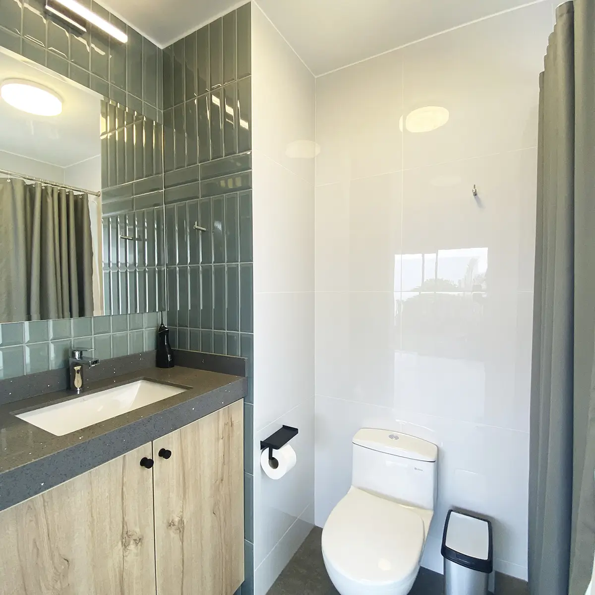 Este baño se diseñó con una combinación de materialidades sobria y elegante; sin dejar de lado el uso del color. Se usó unos ladrillos biselados cerámicos en color verde jade, combinando con un cuarzo estelar plomo, melamine color duna y cerrando con detalles en color negro mate. Se ejecutó en poco tiempo y con estándares estrictos de calidad.